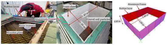 The aluminum frames and rubber layers were joined by high-strength resin. Afterward, the interior container was covered with 20 mm thick foam sheets for truncated sides to reduce the reflected waves in the free field conditions [,]. In addition, plastic sheeting was added to prevent the water in the soil from evaporation. A wooden base plate connected both the shaking table and the first aluminum frame to prevent the soil from being placed on the shaking table directly. Finally, the soil particles were resin at the bottom of the container to represent the frictional surface between the bedrock and the soil, as displayed in Figure 5.