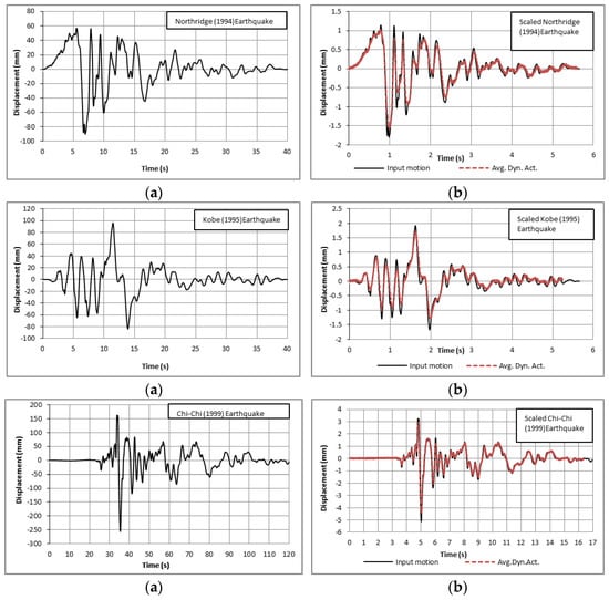 The dynamic electric actuator can measure the output displacement at the direction of movement to ensure the consistency of the obtained records of the input motions. Consequently, the average dynamic actuator records (Avg. Dyn. Act.) are displayed in Figure 7b, which agree with the different scaled input motions.