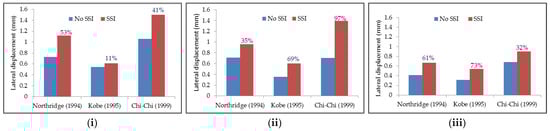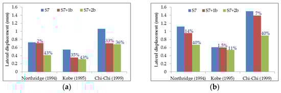 On the other hand, the embedded depth of structural elements has reduced the lateral displacement compared with no embedded element depth. The reduction values may be high or low based on the frequency content of input motion compared with the frequency content of the system. Therefore, by examining flexible models in Figure 14, the embedded element depths have decreased lateral displacements in the upper floors. For example, the lateral displacements at the roof floor level in the S7+1b model reduce by 21%, 14%, and 10% compared with the S7 model under Northridge, Kobe, and Chi-Chi motions. At the same time, the reduction percentages are 42%, 25%, and 39% in the case of the S7+2b model compared with the S7 model under Northridge, Kobe, and Chi-Chi earthquakes, respectively. Consequently, the embedded depths of structural elements have decreased in lateral deflection compared with no embedment depth under different input motions that ensured the previous discussion.