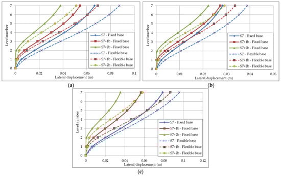 It is displayed that the lateral deflections values of the S7+2b model with flexible base in Figure 13b are the closest to values of the S7 model with a fixed base in Figure 13a under three input motions due to the increasing confining soil around basement stories.