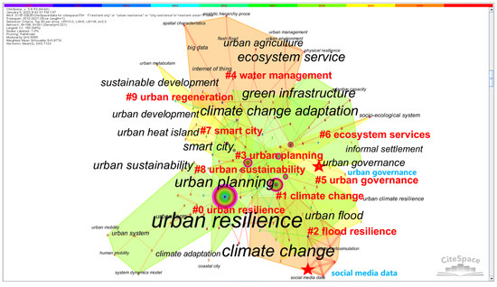 As shown in Figure 2, it is clear that the earlier literature on urban resilience mainly focused on (i) urban resilience in tackling natural disasters and climate change, and (ii) urban resilience in urban infrastructure planning and construction. However, in clusters 2# and 5#, we found that new research directions such as urban governance (the pentagram and the blue label in Figure 2) and social media started to emerge in the study of urban resilience. This suggests that more scholars were researching on urban governance and social media in the development of urban resilience in the most recent two years.