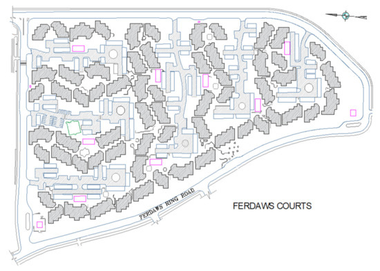 This subsection overviews the Al-Ferdaws housing project located within the campus of King Fahd University of Petroleum and Minerals (KFUPM) in Dhahran, Saudi Arabia. This project was selected as a relatively compact housing planning and design that is uncommon in the Saudi housing environment, as discussed in the literature review. The project was planned to accommodate staff members of the KFUPM faculty and their families on an approximate area of ~14 ha. Along with other interesting elements of landscaping and green areas, the project includes housing blocks, access roads and car parks, pedestrian walkway networks, semipublic open spaces (linear courtyards), and services (mosques and public-events halls). It includes 454 attached or semiattached housing units linearly arranged in two orientations: north–south (N–S) and east–west (E–W). The general density of the project is ~33 housing units per hectare, which is considered reasonable in the context of housing densification in Saudi Arabia under international and local recommendations [11,56].