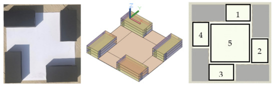 Prior to the planned shading analysis, the selected simulation code must be verified using experimental measurements. To do so, the housing blocks and enclosed courtyards were represented using scaled physical models. These physical models were exposed to the sun in Dhahran city for approximately two weeks during the autumn season (from 25 October to 12 November 2021). The resulting shading in the courtyard was recorded using digital photography (two readings per day). The percentage of shaded area in the courtyard was then calculated using the AutoCAD program. The resulting experimental hourly data were compared with DesignBuilder data using similar settings. Initially, the hourly data of the sunlit fraction obtained from the DesignBuilder simulation tab were applied over the entire open-space surface area. However, these data showed a high discrepancy (~20%) from the measured data. After contacting the software developer, the author learned that DesignBuilder divides any complex surface into several simple square and/or rectangular subsurfaces before calculating the sunlit fraction. In the examined case shown in Figure 4, the open-space external surface was divided into five subsurfaces with different areas. Using the Results Viewer tool, the hourly sunlit fraction values were determined over each subsurface. The value obtained was then multiplied by the subsurface area to obtain the area-weighted average sunlit fraction, which was then divided by the total open-space area to determine the average sunlit fraction Equation (1):