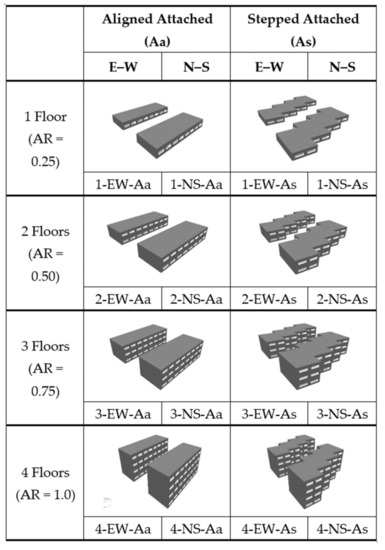 - Window parameters: Window area = 20% of the façade, shaded with internal blinds. Windows in the attached building configurations (aligned and stepped) are provided on the front and back facades only.