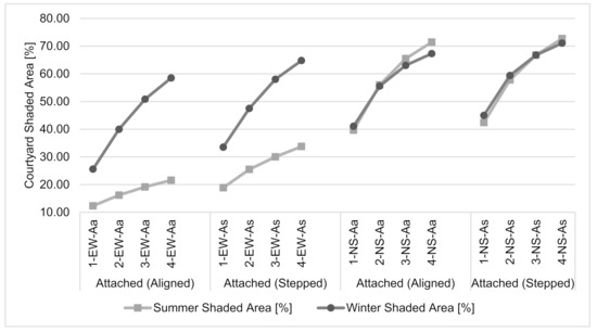 For the four-story buildings in the N–S courtyard orientation, the percentages of courtyard shaded area in summer were 71.5% and 72.7% for the Aa and As configurations, respectively. An insignificant difference between the two configurations was observed in this orientation. However, this orientation generally offers a higher shading potential than that of the E–W orientation, because the long eastern and western facades of the buildings in the N–S orientation are exposed to the low morning and evening sun, which significantly increases the amount of shading in the open space (Figure 8). Thus, it was concluded that the N–S orientation of the courtyard offers more summer shading than the E–W orientation in both the stepped and aligned attachment methods. However, the stepped attachment method improves the shading potential in the E–W orientation, the usually recommended orientation in hot climates.