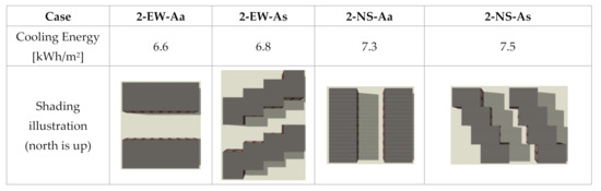 Furthermore, the impacts of the examined configurations on the thermal performance of the buildings are important. Figure 8 shows the impact of the attachment method (Aa or As) on the normalized cooling energy in summer. With smaller surface area than the As buildings, the Aa buildings required lower cooling energy in both the E–W and N–S orientations. Meanwhile, the E–W orientation required less cooling energy because the long building facades were not directly exposed to the east and west sunrays. However, case 2-EW-As required slightly higher cooling energy than case 2-EW-Aa, because (owing to its stepped pattern) case 2-EW-As was partially exposed to the east and west sunrays. This increase may be mitigated by the higher shading potential of stepped buildings than that of the aligned ones, as demonstrated in the previous subsection.