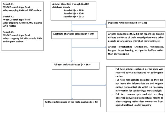 For the purpose of meta-analysis, an extensive literature search of published papers was conducted during November 2021 using the Web of Science Core Collection (WoS CC) database. Search terms used in the first search were “alley cropping” AND “soil” AND “carbon”; in the second, they were “alley cropping” AND “soil” AND “organic” AND “matter”; and in the third, “alley cropping” OR “silvoarable” AND “soil organic carbon”. These three searches identified 940 papers that were searched for data on SOC or SOM in alley cropping systems and sole crop systems. We excluded manuscripts where agroforestry sites were established from natural forests and then compared with agricultural fields without trees. We focused our review only on research in which trees were introduced into agricultural fields and whether any change was reported compared to SOC in agricultural fields. We excluded manuscripts reporting total C and focused on studies reporting only SOC or SOM as we were interested in the C input from biomass (tree and crop). A total of 43 articles were identified with such data (Figure 1). For these 43 articles, using these two data sets (SOC in alley cropping and SOC in sole crop system), relative soil organic carbon values (RSOC) of SOC were calculated in alley cropping (alley cropping SOC/agricultural SOC). The collected data on relative soil organic carbon (RSOC) in alley cropping systems were used to conduct a meta-analysis from the reviewed literature. Such an approach is commonly applied in the meta-analysis, where experimental treatment values and control treatment values are used to calculate the relative values for each study []. This procedure was deemed necessary to harmonize the data and minimize the influence of diverse approaches in the data. These procedures created a total of 377 data sets that were used in further analysis (Table 1).