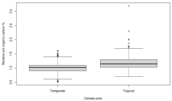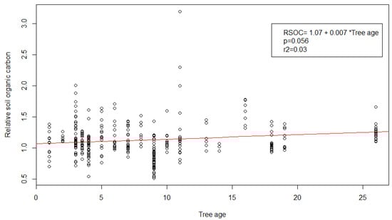 Although weak, the effect of tree age (p < 0.056) supports the findings of other authors who report an increase in SOC over time [,,,,], which can be observed in Figure 3. However, not all trees mature the same, and since there was no interaction between the tree age and the tree family, we tried the model with tree age and tree family. Therefore, the model was refined by including the tree family (RSOCij = β0 + β1 × Tree Ageij + β2 × Tree familyij ai + εij). However, such a model was less supported (judged by ΔAIC). Since different tree species are used in different regions, we hypothesized that different tree species produce different amount of biomass and, therefore, may influence the C input into soil differently. However, model 2 shows no significant effect of the tree family on RSOC. The climate zone has been shown to have a significant effect on the RSOC, given that data from the tropical climate zone were significantly higher than RSOC values in the temperate zone (p < 0.037). The tropical zone includes data from degraded soils in Africa, Asia, and South America, where introducing trees had the most beneficial effect on SOC.