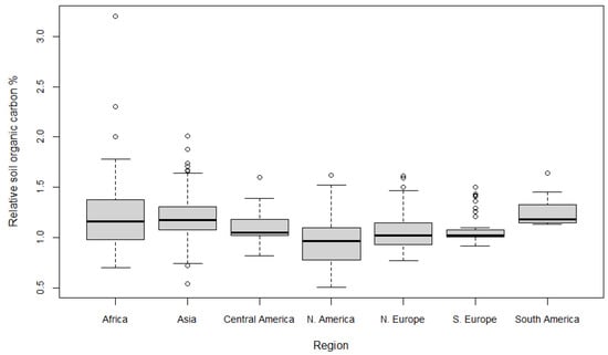 Relative soil organic carbon (SOC in alley cropping/SOC in agriculture) by regions.