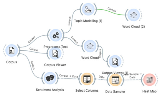 Figure 1 exhibits the entire schema of the model designed by the OrangeTM toolkit. The model executed three types of analyses: word cloud, topic modeling, and sentiment. In the first stage, the corpus component was used to load scientific papers and expert opinion columns to the database. These documents were visualized using the Corpus Viewer component. In the next phase, each document’s abstract was “cleaned” from undesired text such as numbers, symbols, and adjectives to ready it for analysis using the Topic Modeling component. In addition, the Word Cloud component was used to evaluate the frequency of words in each document and to present a complete frequency-based diagram on both types of documents. The Sentiment Analysis component was used to present the sentiment heat map (prepared with the help of the Heat Map component). In preparation for this, sentiment data was selected using the “Select Columns” and “Data Sampler” components with the following configuration: Selected Features: positive, negative, neutral, and compound patterns; Target = Category; Metadata = Tests. The advantage of this diagram lies in its simplicity. However, in order to perform complex diagrams and further analyses (such as in the case of topic modeling), it was also mandatory to execute programming code (in JavaScript and R).