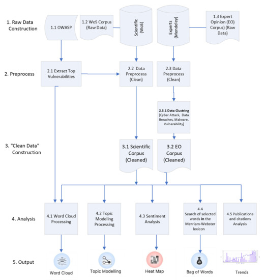 Following Mounika et al. [21], the OWASP’s top vulnerabilities (score > 9.0) in the last 3 years were extracted. This process was based on the CVE® list (cve.mitre.org, accessed on 29 December 2021) and the CVE Details Ultimate Security Vulnerability Data source (www.cvedetails.com, accessed on 29 December 2021). Those sources provide up-to-date information related to common cyber vulnerabilities and exposures (CVEs) according to family categories. The details related to each CVE were saved in a separate row in an Excel file designed with the following columns: Column 1—Sequence Number; Column 2—CVE ID; Column 3—Publication Date; Column 4—CVE Description. In addition, following Ahmed et al. [19], a total of 3742 opinion columns written by cyber experts were harvested from the Mendeley repository. The repository was clustered into 4 groups according to its labels: (1) Cyber Attack, (2) Data Breaches, (3) Malware, and (4) Vulnerability. The articles in each cluster were analyzed using several text mining tools (JavaScript, R code, and OrangeTM toolkit) as described below (refer to Topic Modeling and Sentiment Analysis) to generate topic modeling and a word cloud for each cluster.