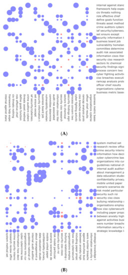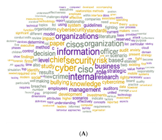 As shown in Table 5, topic specificity (a measure of venues that depends on the titles of the papers published in a specific venue over a specific year) assumes that longer words often carry more specific meaning (close to 1), whereas shorter words may not belong to the examined topic at all (close to 0) and word frequency analyses were performed on the scientific corpus for each of the following categories: risk assessment, cyber guidelines, and cyber risk management. In the risk assessment category, the words “audit”, “internal”, “cyber”, and “officer” received the highest specificity score (close to 1). In the cyber guidelines category, the words “cyber” and “organization” received the highest specificity scores (1 and 0.83, respectively). Finally, in the cyber risk management category, most of the words received a low topic specificity score ranging between 0.032 and 0.2. Moreover, the word cloud distributions conducted on the abstracts and titles of documents extracted from the scientific corpus (Figure 6A,B) and the expert opinion columns (Figure 6C) provide interesting results. While Figure 6C indicates that the investment in CISO training and knowledge to cope with cyber breaches is quite low (the relevant words hardly appear in the cloud’s center, and when they do, they are in quite a small font), Figure 6A,B shows that the role of the CISO as a guard against cyber threats is of importance. Words such as “management”, “knowledge”, “CISO”, and “study” appear frequently in these word clouds, thus pointing to their importance. This finding was also supported by the topic modeling correlation analysis conducted on the scientific corpus of documents belonging to the risk assessment cluster. The analysis revealed that the abstracts do not contain much information on the attitude toward investment in CISOs’ skills and training, but they mention its importance. For example, the evaluation of the blue dots reveals that phrases such as “The effective role of the chief information security officer …” are not considered to have priority over other topics (i.e., they are portrayed as small dots). On the contrary, topics that discuss security solutions, i.e., “organizations’ cyber security defense solutions”, are preferred (Figure 7A). In the risk assessment cluster, the most prominent topics found via this analysis were threats and vulnerabilities, audit risk, cyber fighting activities, organization processes, framework, and threats. The least prominent topics were CISO and research. In the same manner, the most prominent topics contained in at the scientific corpus of documents belonging to the “CISO + guidelines” cluster (Figure 6B and Figure 7B) were education, risk management and model, cybercrime, business activities, and information security. The least prominent topics were security and method officer. For example, in Figure 6B, the dominant words were “study”, “management”, and “CISO”, while Figure 6B showed “CISOs’ strategic knowledge” and “CISO employment by organizations ” to be dominant.