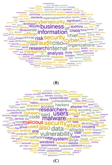 (A) Word cloud distribution of WoS documents (label = risk assessment). (B) Word cloud distribution of WoS documents (label = cyber guidelines). (C) Word cloud distribution of expert opinion columns.