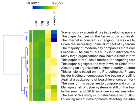 The R script and the jsLDA master code in JavaScript language were used for topic modeling analysis. The LDA (Latent Dirichlet Allocation) algorithm postulates that each document may contain several words that may be affiliated with distinct topics in the document. For the scientific corpus, the text of each document was cleaned and categorized in the following citation degree scale (ranging from 1 to 5, where 1 = low and 5 = very high) according to the number of affiliated citations in each paper. Documents with 0–10 citations were defined as having an overall citation degree of 1; the amount of 11–20 citations granted the paper an overall citation degree of 2; papers with 21–30 citations were set to have an overall citation degree of 3; papers with 31–40 citations were set at an overall citation degree of 4; and papers exceeding 41 citations were defined as having an overall citation degree of 5. No pre-processing was performed on the expert opinion column list. However, topic modeling and a word cloud were constructed to evaluate whether the content of documents related to the CISOs’ performance and skills matches the companies’ willingness to invest in their training. Finally, sentiment analysis was conducted on the scientific and the expert opinion corpora.