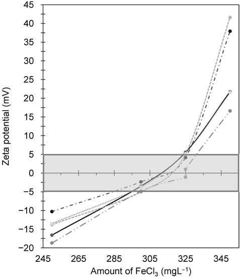 The stability of colloidal systems can be inferred from the electrokinetic potential (zeta potential). The Doppler effect electrophoresis method was used to measure the zeta potential. The purpose of coagulation is to separate unstable colloids. The goal is to reach a zeta potential of 0 mV, i.e., the state in which the van der Waals forces and the chemical binding forces are predominant [48]. The marker in Figure 1 shows the range of the optimum coagulant amount, where the zeta potential value is between 0 ± 5 mV. For the synthetic LGW, we would need an amount between around 295 mgL−1 and 325 mgL−1 of coagulant in order to efficiently coagulate the sample.