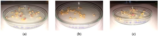 A 72-h germination test. (a) Irrigation with tap water; (b) irrigation with raw LGW; and (c) irrigation with treated LGW.