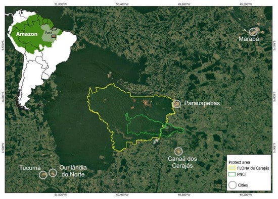Map of the region showing towns of Canaã dos Carajás, Ourilândia do Norte, Parauapebas, Tucumã and Marabá (grey circles) in relation to the area where the survey was carried out (FLONA de Carajás—yellow outline and Parque Nacional dos Campos Ferruginosos—PNCF—green outline). Dark green cover represents pristine primary vegetation, mottled grey and green denotes deforestation in the region.