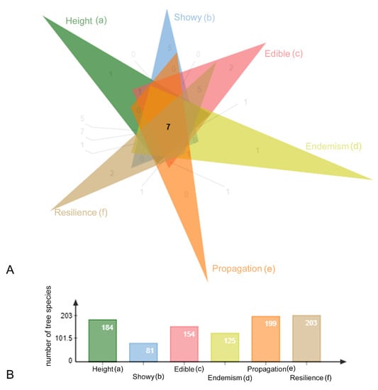 (A) Venn diagram showing the selected species according to the six chosen features. (B) Graph showing the number of tree species grouped per feature. (a. Appropriate height, b. Showy flowers, c. Fruits attractive to wildlife and to humans, d. Amazonian distribution, e. Known propagation methods, f. Resilience).