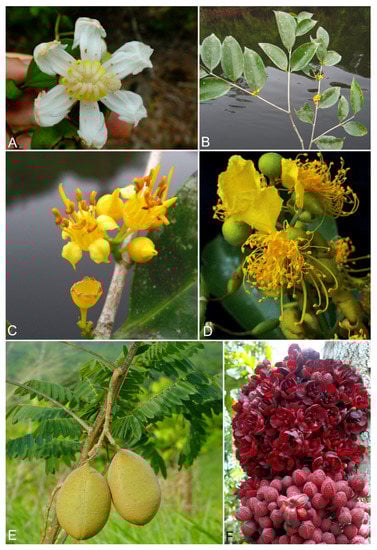 Trees with compound, alternate imparipinnate leaves, rachis not winged, 8–13 pairs of leaflets, bilateral flowers arranged in racemes, corolla with a single, white petal, stamens showy, in two groups, anthers bright golden-yellow. Indehiscent, hard pods to 6–18 × 3 cm, 6–8 seeds surrounded by yellow, fleshy aril (Figure 3E).