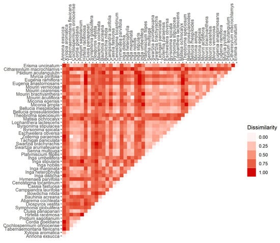 Regarding the complementarity among pair of tree species, values of dissimilarities varied from 0 to 1, with mean of 0.553 and median of 0.603 (Figure 4 and Supplementary Material Table S3). In the PCoA analisys he species that are ordinate closer in the space present smaller dissimilarity values than species ordinate further apart, and this analysis explained 41.39% of species dissimilarities (Figure 5).