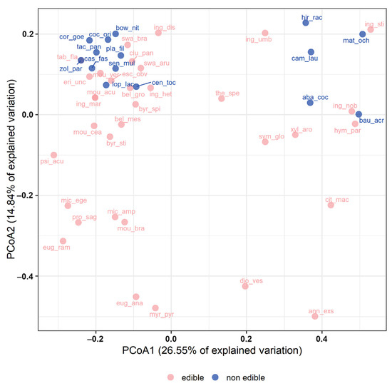 Considering that seven species would not have been enough to offer all the benefits expected from urban afforestation, we provide a list of 49 species (Table 2) with further information regarding pollination syndromes (bees, butterflies, birds, bats) and phenology. This list may be used to select a cohort of species that encompasses the diversity of plant-animal interactions and/or, likewise, to choose a series of plants that flower and fruit at different times for their ornamental value and interest. Such selection may be guided to ensure there are resources to maintain wildlife, especially vertebrates, that depend upon resources throughout the year [61]. Having this in mind we provided a complementarity analysis (Figure 4, Supplementary Material Table S3) to enable practitioners to choose species pairs that are dissimilar in terms of their attributes to ensure that a maximum biodiversity is fostered by the plantings. Another way to guide managers is presented in the form of a PCoA analysis where the plants with edible and inedible fruits are displayed (Figure 5). This is another way to visualize and pick species that exhibit different features, such as flowering during different periods of the year or being pollinated by different agents.