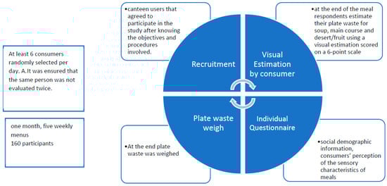 The study flow was organized in four steps, starting with the recruitment of participants who were informed on the objectives of the study and ending with the weighing of plate waste (Figure 1).
