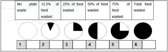 Visual estimation was performed by each participant at the end of the meal in order to estimate individual plate waste for soup, main course, and dessert/fruit. Keeping in mind the appearance of full servings and their variability, the amount of food wasted on each plate was scored on a 6-point scale, adapted from the one by Comstock et al. [39]. If the plate was left untouched, a score of 6 was given; if at least one bite was eaten, a score of 5 was attributed, corresponding to 75% of plate waste; if half the food remained, a score of 4 was scored; if one-quarter remained corresponding to 25% of plate waste, the score for the food item was 3; and if less than one quarter was wasted, a score of 2 was given; a score of 1 was assigned when no plate waste occurred [39] (Figure 2).