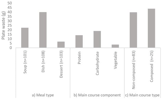 According to visual estimation, 46.3%, 54.4%, and 58.1% of the respondents mentioned “no food waste” for soup, main course, and dessert, which is in line with another study where even higher values of 72% of consumers indicated that they had no food waste [10]. High standard deviations observed on plate waste may result from consumers’ preferences, meal characteristics, and appetite.