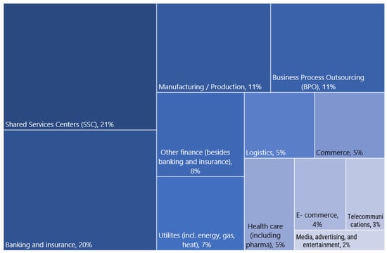 These enterprises were from sectors such as shared services centers (SSC), the manufacturing industry, professional services centers for business (BPO), and banking and insurance companies (Figure 2). Again, this was in line with the literature research carried out by the author, demonstrating that these sectors were world leaders in implementing RPA solutions [,,,].