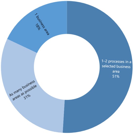 Placing RPA into effect in a series of small steps was the dominant method of implementation for most of the surveyed enterprises, with 66% reporting the use of this type of approach. The remainder reported that they had, instead, used significant undertakings in their approaches. In those that had taken small steps, it was found that usually no more than two processes or so were applied within a selected business area, meaning the scope of RPA was fragmentary in most cases (Figure 4). This implies that the surveyed enterprises were being very conservative or, one could say, cautious in their approaches to RPA; they only analyzed options currently available. Even so, for a number of the surveyed enterprises (31%), RPA was viewed as an extensive undertaking. These companies realized that RPA was becoming an important element of digital transformation and were planning implementations, or had already implemented, in as many business areas as possible.