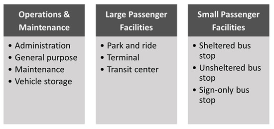 In 2012, the Texas Department of Transportation (TXDOT) [25] classified transit facilities into three main categories and eight subcategories, as shown in Figure 1. The three main categories of transit facilities are operations and maintenance, large passenger, and small passenger. These classifications reflect the nature and characteristics of rural transit facilities and are beneficial for further analyses and efficient management [26].