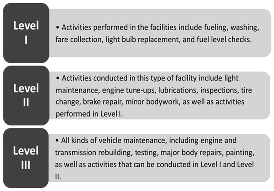 The American Public Transportation Association recommended useful practices for implementing a new bus transit facility project and maintenance services in 2010 [27]. The activities associated with the facility services and maintenance were categorized into three classes and levels (Level I, Level II, and Level III), as presented in Figure 2. Their classification leads to higher performance, efficient funding allocation, and effective management of rural transit facilities [28,29,30].
