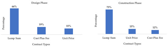 This step investigated the contract type associated with the 26 collected surveys. As presented in Figure 4, the contract types of the design phase for rural transit facilities were lump sum, unit price, and cost plus fee. This figure shows that 66% of the contract types were lump sum for the design phase. The contract types for the construction phase were lump sum, unit price, and cost plus fee; most of them (73%) were lump sum. Obviously, lump sum is the dominant contract type in both the design and construction phases of rural transit facility projects. In a lump sum contract, the contractor agrees to complete the project for a fixed price. This contract type has less risk for the contractor when the scope of the project is well-defined [41,42].