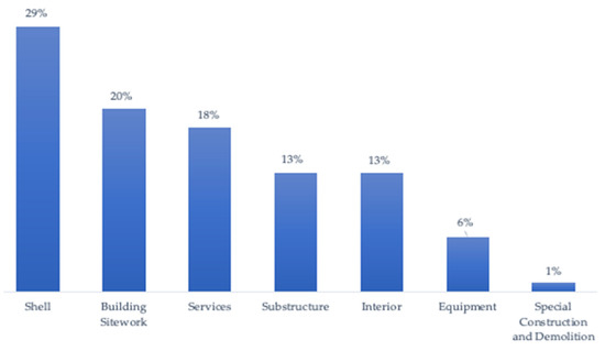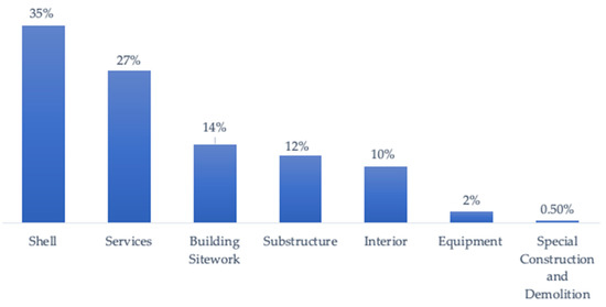 The transit facility projects, comprised of four Categories (administration, operation, maintenance, and vehicle storage), are referred to as Combination I. The percentage associated with the cost breakdown of each construction system is indicated in Figure 5.