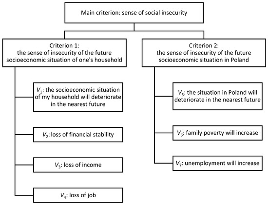 Stage 1. The hierarchical structure of the multiple-criteria problem of the sense of social insecurity was created by breaking it down into the following elements: the main evaluation criterion (i.e., the sense of social insecurity) and subordinate criteria (the sense of insecurity of the future socioeconomic situation of one’s household and the sense of insecurity of the future socioeconomic situation in Poland), variables (V1–V7) (Figure 1). The main criterion was placed at the top of the hierarchy and consisted of two subordinate criteria. These included several qualitative variables describing the households surveyed.