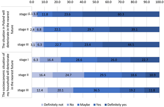 This study presents the respondents’ feelings concerning the social security of their households and their perception of the security of the future situation in Poland expressed at three stages of the research. The respondents expressed their sense of insecurity about the future of their households, including their subjective feelings about the deterioration of the situation of their households in the near future, the loss of financial stability, income, and jobs. The respondents’ feelings about the situation of their households were compared with their sense of insecurity about the future situation in Poland. The respondents assessed the possible deterioration of the situation in Poland in the near future, an increase in unemployment and poverty in families. The comparison of the respondents’ feelings about the possible deterioration of the situation of their households and the situation in Poland revealed a dichotomy. At the first stage of the research almost 84% of the respondents (answers: yes and definitely yes) assumed that the situation in Poland would deteriorate, 60% of whom were sure of it (Figure 2).