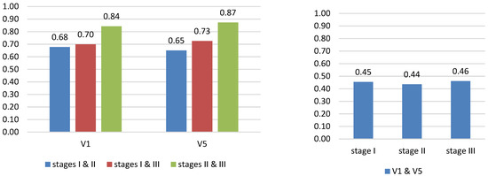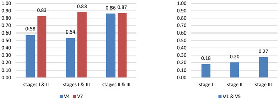 Values of the RSC index showing the degrees of similarity between the research stages and variables in relation to the respondents’ perceptions of changes in the situation their households and the situation in Poland. Note: V1: the socioeconomic situation of my household will deteriorate in the nearest future, V5: the situation in Poland will deteriorate in the nearest future. Source: Authors’ own elaboration based on [44].
