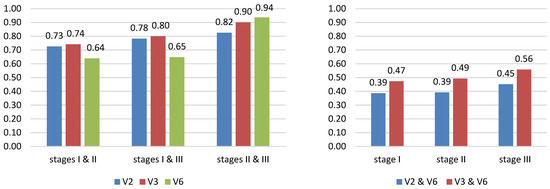 Values of the RSC index showing the degrees of similarity between the research stages and variables in relation to the respondents’ perceptions of increase in the poverty of their households, loss of financial stability, and income. Note: V2: loss of financial stability, V3: loss of income, V6: family poverty will increase. Source: Authors’ own elaboration based on [44].
