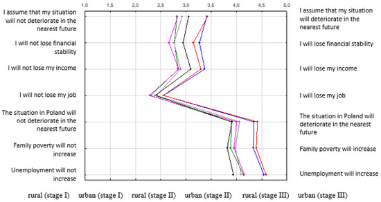 A graphic profile of rural and urban respondents’ perceptions of the future situation of their households and the situation in Poland (stages I-III). Source: Authors’ own elaboration based on [44,56].
