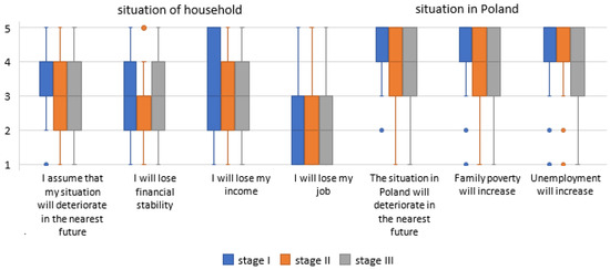 A box plot of the respondents’ perceptions of the future situation of their households and their opinions on the future situation in Poland (stages I-III). Source: Authors’ own elaboration based on [44].