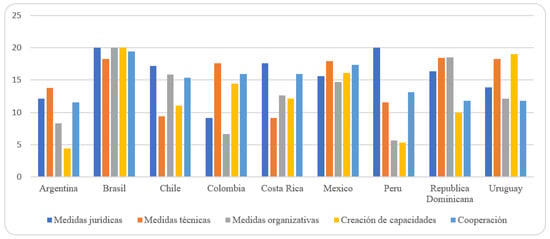 Reviewing Figure 2 highlights the legal measures issued in terms of cybersecurity, data protection, and critical infrastructures. At this point, the highest rates were in Brazil and Peru, with the highest score (20), and in Chile, with a high degree of compliance (17.2). Another pillar of importance is cooperation, relating to the evaluation of whether the countries have agreements (bilateral and multilateral) or alliances that contribute to the exchange of information, good practices, and uniformity in security measures; it is worth highlighting the scores of Brazil (19.41), Uruguay (19.04) and Mexico (17.34) here.