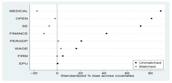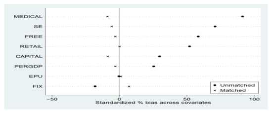Next, by comparing the standardized deviations of related covariates before and after matching, we examined the effect of matching between treatment group and control groups. As can be seen from Figure 1 and Figure 2, after matching, regardless of the aspect of industrial structure or social employment, the standardized deviations of covariates between the treatment group and the control group were closer to 0%. Therefore, the total sample bias was significantly reduced. It indicated that after the selected sample underwent PSM, the differences in relevant covariates between the treatment group and the control group were significantly decreased, and the distribution of sample observations was more balanced, which effectively eliminated endogenous concerns caused by sample selection bias and further demonstrated the feasibility of the PSM-DID method.