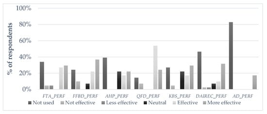 Figure 2 displays the performance responses for the seven approaches (FTA_PERF, FFBED_PERF, AHP_PERF, QFD_PERF, KBS_PERF, DAIREC_PERF and AD_PERF). As can be seen, a zero-performance result was reported for all seven approaches, ranging from approximately 15% of the sample for the QFD method to over 80% of the sample for the AD approach. High levels of performance were also reported for all seven approaches, ranging from approximately 17% of the sample, for the AD method, to approximately 37% of the sample for the FFBD approach.