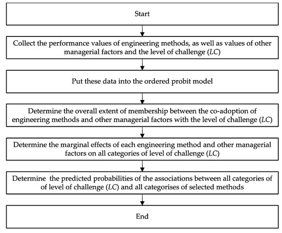The whole procedure for deploying the ordered probit model is shown in Figure 3. Obtaining the relative values of all variables indicated in this study is the first stage in this procedure. These numbers came from a variety of sources, including Likert scale measurements, binary data, continuous data and categorical data. The data on the level of challenge (LC) are then connected to a wide variety of engineering methods and other managerial factors in the next phase to highlight membership between these variables and LC. In the following step, the marginal effects associated with each change in all variables on LC are determined. Marginal effects analysis provides further insights and a useful measure for the degree of influence of the independent variables on LC_m improvement [36]. Finally, the estimated probabilities of membership in the various LC categories and a range of values that such selected variables can take are computed to get further insight into the relationships that these variables have with the level of challenge (LC). According to Chan, Miller and Tcha [36], the predicted probability analysis provides a good indicator with the objective to shed light on the actual levels with which the different levels of the FTA_m and AD_m variables are represented in LC_m categories.