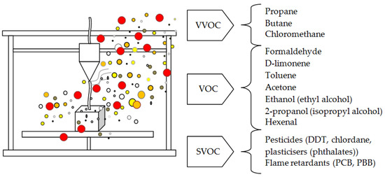 Three-dimensional printing features various kinds of filaments, including ABS, ASA, PLA, PET, HIPS or PS, in many different colour combinations. During 3D printing, the nozzle through which the material passes is heated to 180–270 °C. In some cases, the worktable is also heated within a temperature range of 40–110 °C. When the nozzle and plastic are heated, gases and solid particles which have a negative impact on the natural environment are released; see Figure 1. Volatile organic compounds are emitted and these affect the human body as well [11,12,13]. A VOC is any organic compound that has an initial boiling point less than or equal to 250 °C measured at a standard atmospheric pressure of 101.3 kPa. This classification means that most of the compounds classified as VOCs and VVCOs will evaporate during the passage of the working material through the hot end, where the temperature, depending on the filament used, is in the range of 180–270 C degrees. VOCs are sometimes categorised by the ease with which they will be emitted. For example, the World Health Organisation (WHO) categorises indoor organic pollutants as: