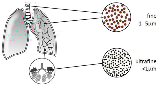 Research carried out so far indicates that 3D printers are sources of many volatile organic compounds and particles which are released into the air in rooms where additive manufacturing takes place [14,15,16,17]. These are solid and volatile particles which are inhaled and thus enter the human body; see Figure 2. These ultrafine particles can even penetrate through the skin into the bloodstream. It should also be noted that the accumulation of many printing machines in one room further exacerbates the pollution that has a negative impact on human health.