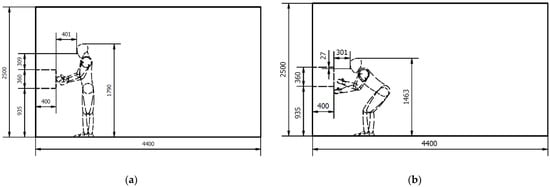 The modelling was conducted in the ANSYS Fluent 2021 simulation environment [34]. The printer operator, standing in front of the printer or leaning towards it, pulls the finished model out of the printer, opens the printer door during the process, adjusting the filament, and reacts to process disturbances. During that time, pollutants generated during printing are emitted onto the operator. Therefore, the model was prepared for two operator positions: (a)—standing in front of the printer and (b)—leaning in front of the printer, Figure 4a,b. The printing takes places in a closed room with a printer with a closed print chamber. The dimensions of the simulation room were assumed as follows: length 4.4 m, height 2.5 m, width 2.6 m (V = 28.6 m3). A printer with the following dimensions was placed in the room: width 0.526 m, length 0.400 m, height 0.360 m (V = 0.075 m3). The door at the front of the printer, through which pollutants are emitted, measured 0.37 m (width) by 0.22 m (height) (0.080 m2).