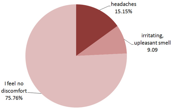 Between October and November 2021, the authors of the study carried out a survey of Poznań University of Technology students and staff, asking about home, company and school use of 3D printers. A total of 35 people participated in the study, mainly students and employees of the Poznań University of Technology. The people taking part in the study are people who use additive manufacturing in their daily work as well as in their free time. The demographics of responders were as follows: aged 21–30 years (88.6%); 31–40 years (11.4%); gender of responders: men 94%; women 6%; place of printing: big city 58%; small towns or villages 42%. In total, 24% of the respondents admitted that they experienced headaches or irritating odours during 3D printing; see Figure 5.