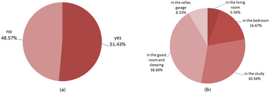 Among all the respondents, over a half use a 3D printer at home; see Figure 6a. No fewer than 61% of them use a 3D printer in a room in which they spend a majority of their day, entertain guests or sleep; see Figure 6b.