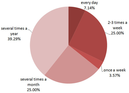 The responders indicated that they used 3D printers often or very often. Additionally, 30% of the respondents print several times a week, with over 7% of them printing every day; see Figure 8.